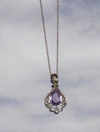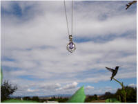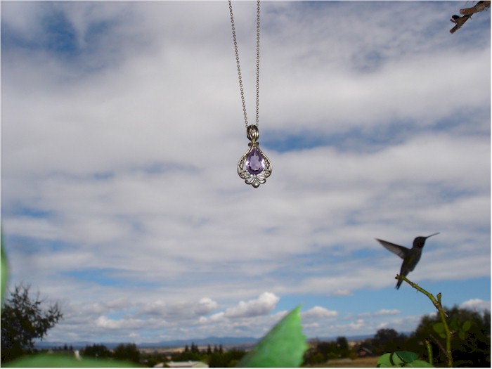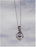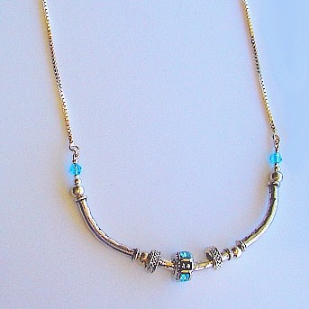 Crystals and Tibetan Silver arcs suspended on silver box-link chain necklace. |