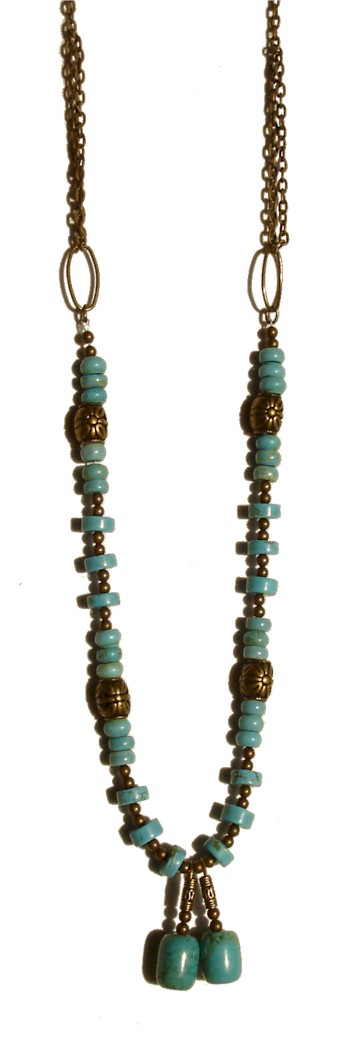 Turquoise with veins of gold descend down from an antique bronze